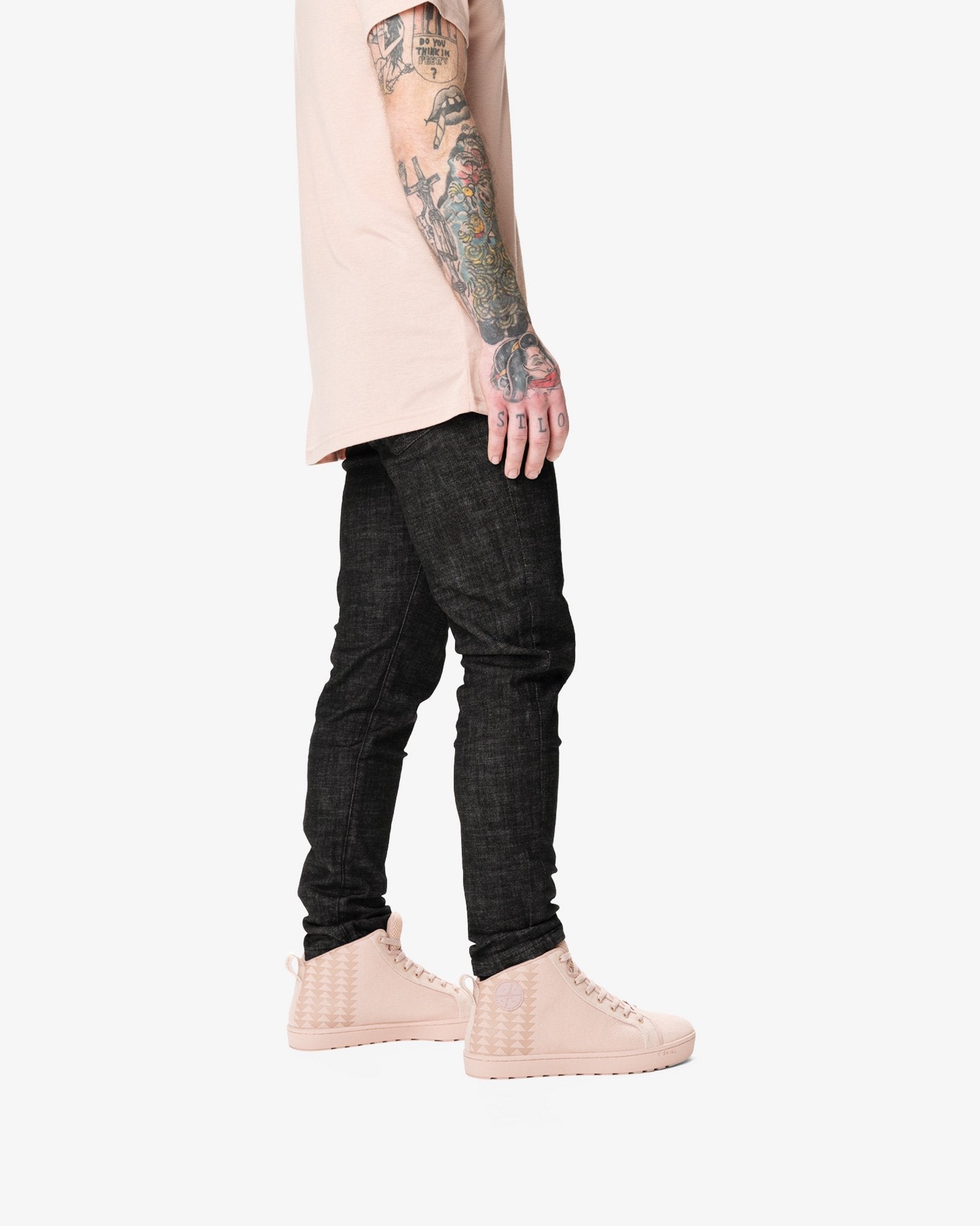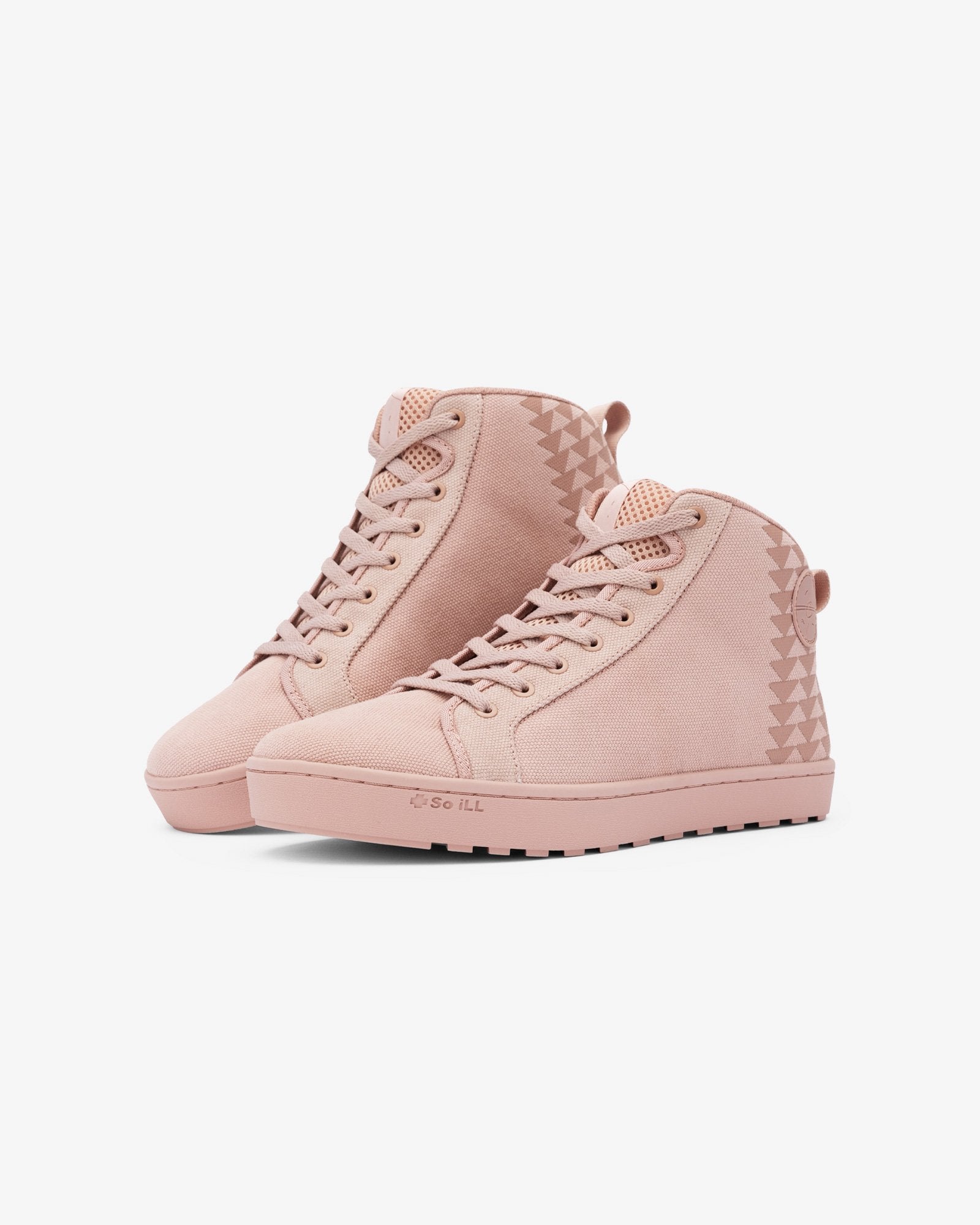 The Dirty Pink Drifter, the first mid-top shoe in the So iLL x On The Roam collection, by Jason Momoa, includes Mano patterned heel and features a 100% organic cotton upper with water resistant coating, a 30% BLOOM resin insole (an alternative to synthetic and petrochemical EVA foams) with a top layer of cork, and an aggressive rubber outsole.