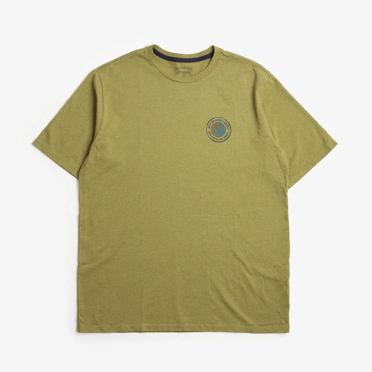 The artwork for Patagonia's Unity Fitz styles has a stylized Earth and the message “we're all on this together,” plus the gist of our purpose statement “save our home planet.” It's printed on a T-shirt made with 100% recycled fabric that reduces our reliance on virgin raw materials. Made in a Fair Trade Certified™ factory.